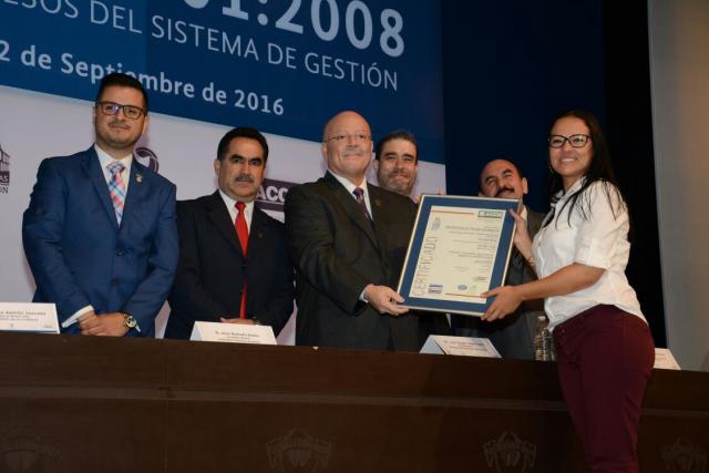 El lunes 12 de septiembre se llevó a cabo en el Teatro Universitario de la ciudad de Culiacán el acto protocolario de entrega de los reconocimientos de Certificación en la Norma de Calidad ISO 2009, de diversos procesos, en nuestra Facultad se certificó el proceso de «Promoción, incorporación y seguimiento del programa de movilida estudiantil» siendo responsable la profesora Rosa Leticia Ibarra Martínez.