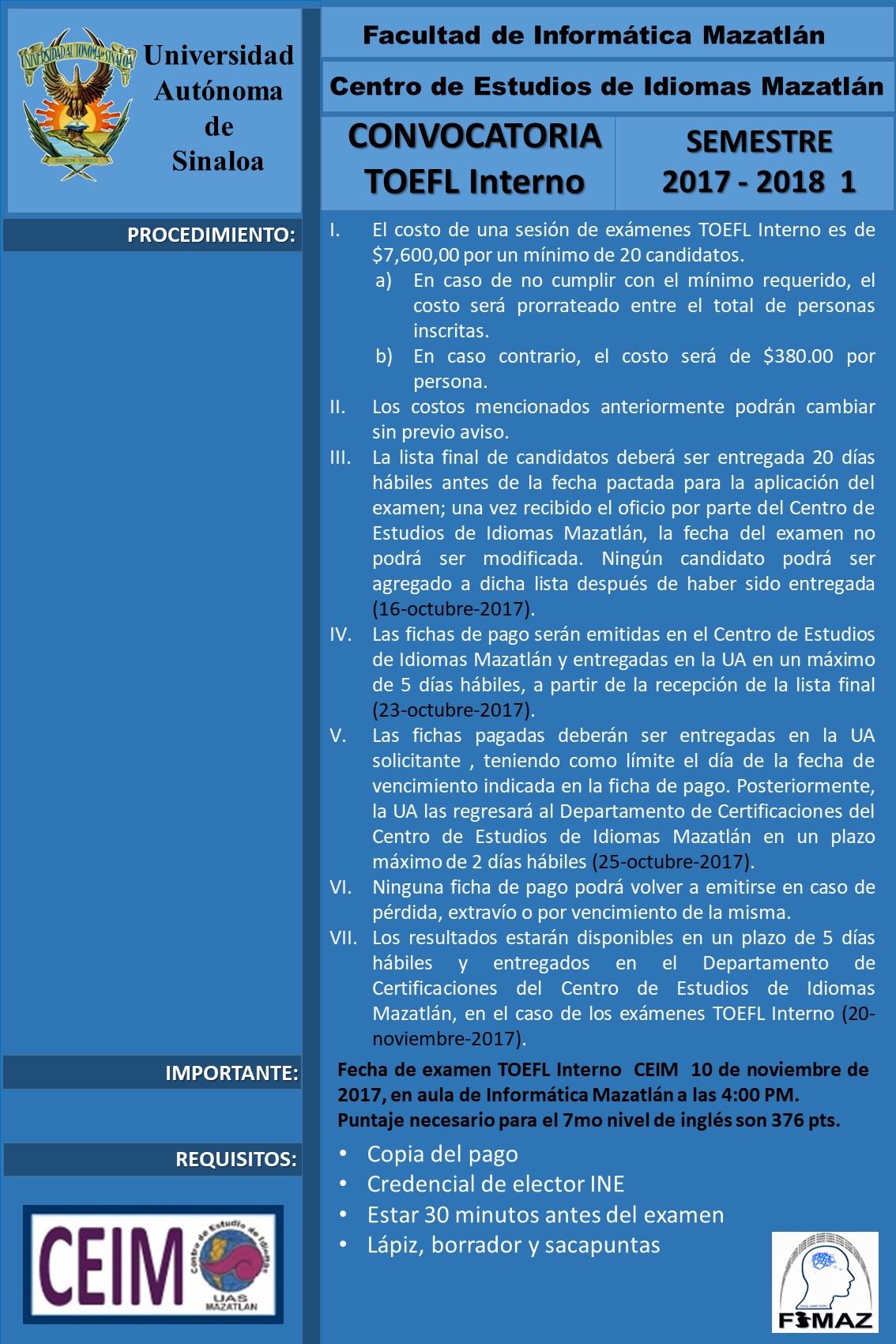Dicho examen se utiliza para adquirir el nivel correspondiente sobre el manejo del idioma. El examen se llevó a cabo en el aula 8 en un horario de 16:00 a 19:00 horas.