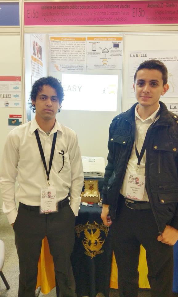 Donde los estudiantes Oscar Baltazar Zatarain Perez y José Ramón Osuna Osuna de la Universidad Autónoma de Sinaloa de la Facultad de Informática Mazatlán tuvieron una extraordinaria participación al ganar el tercer lugar con el proyecto titulado “Asistente de transporte público para personas con limitaciones visuales” asesorados por la Dra. Alma Yadira Quiñonez Carrillo profesora e investigadora de esta Facultad.
