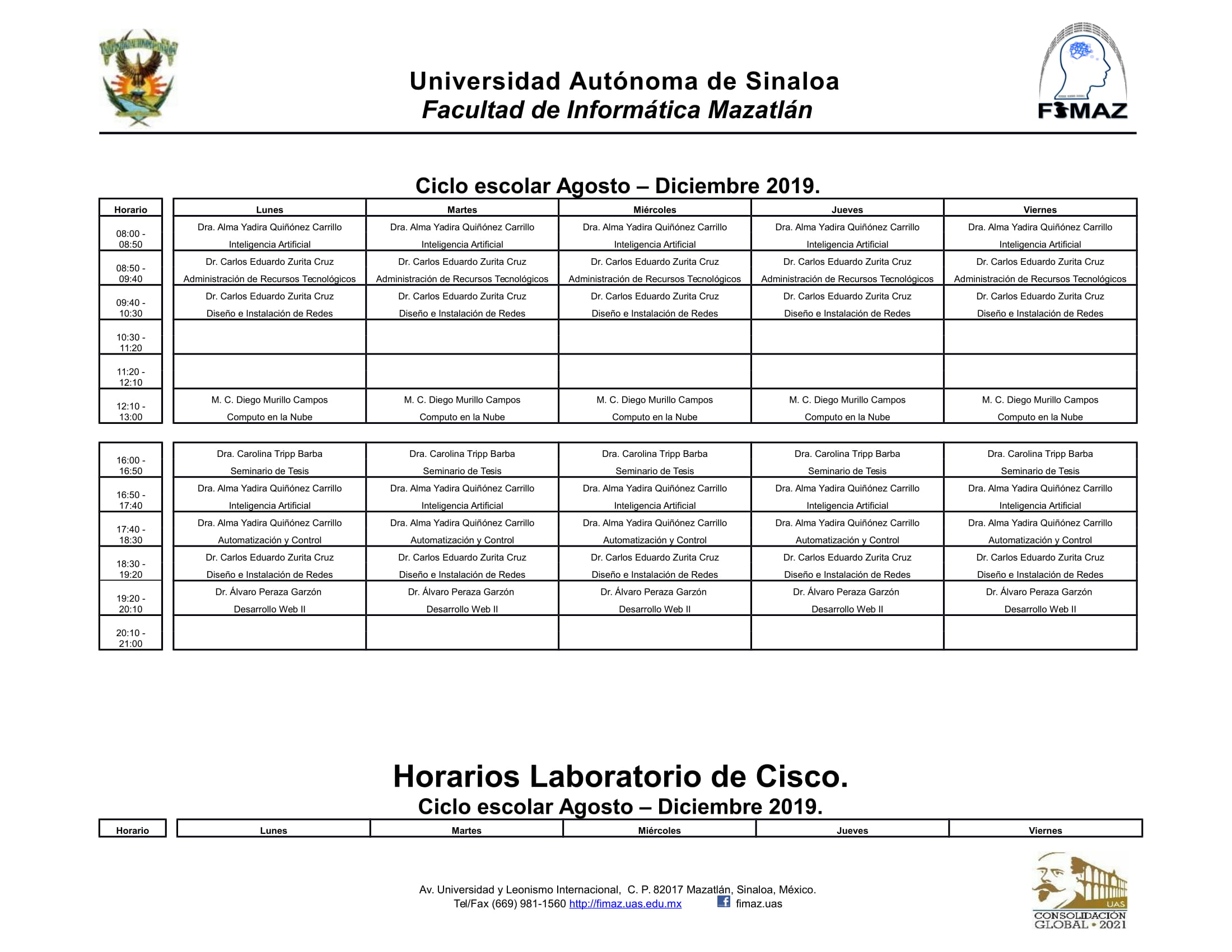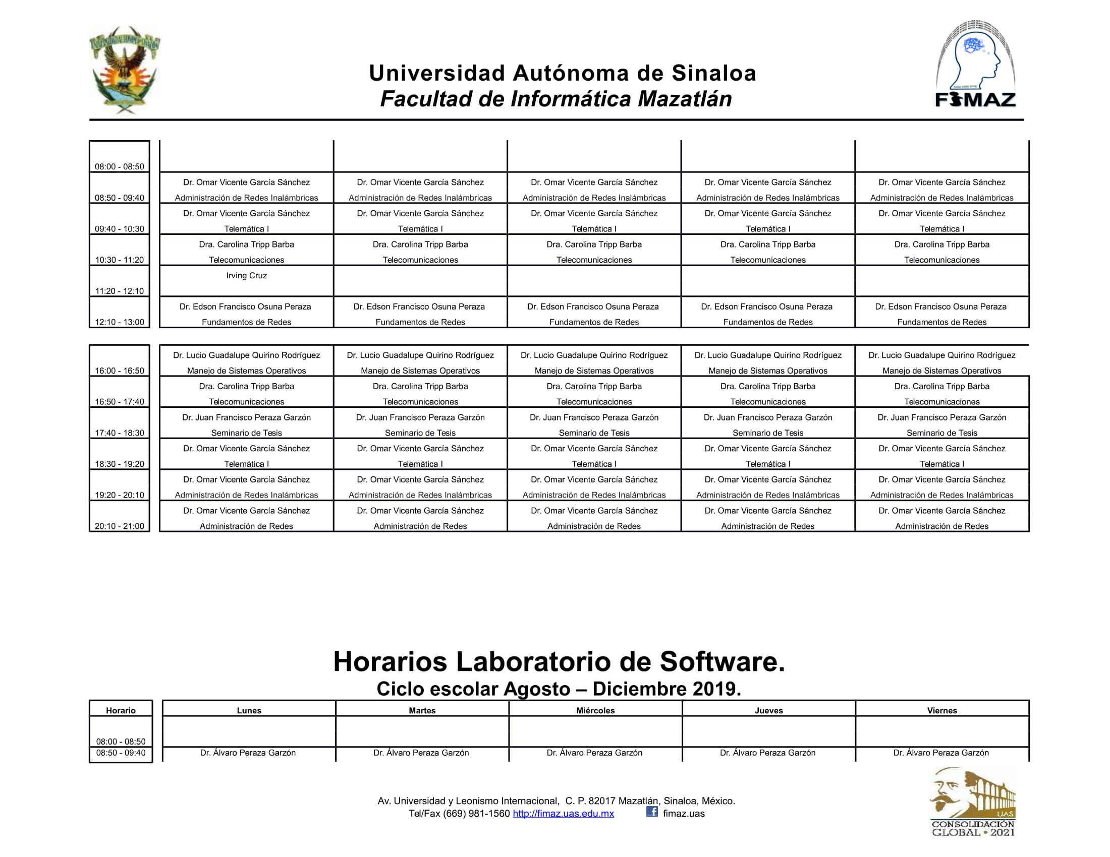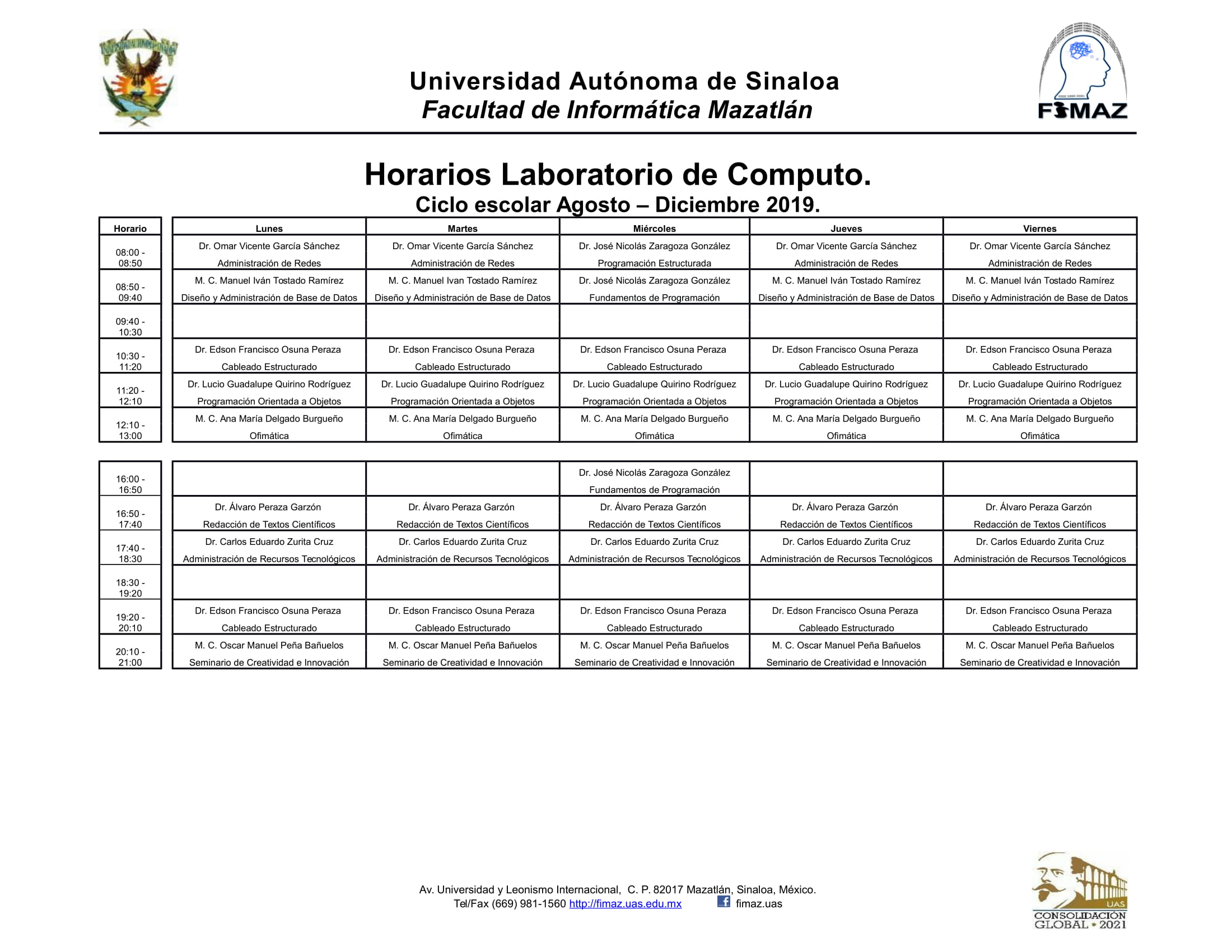 Por este medio se les da a conocer la relación de horarios de los laboratorios de computo que están programados para el semestre comprendido de Agosto – Diciembre de 2019.