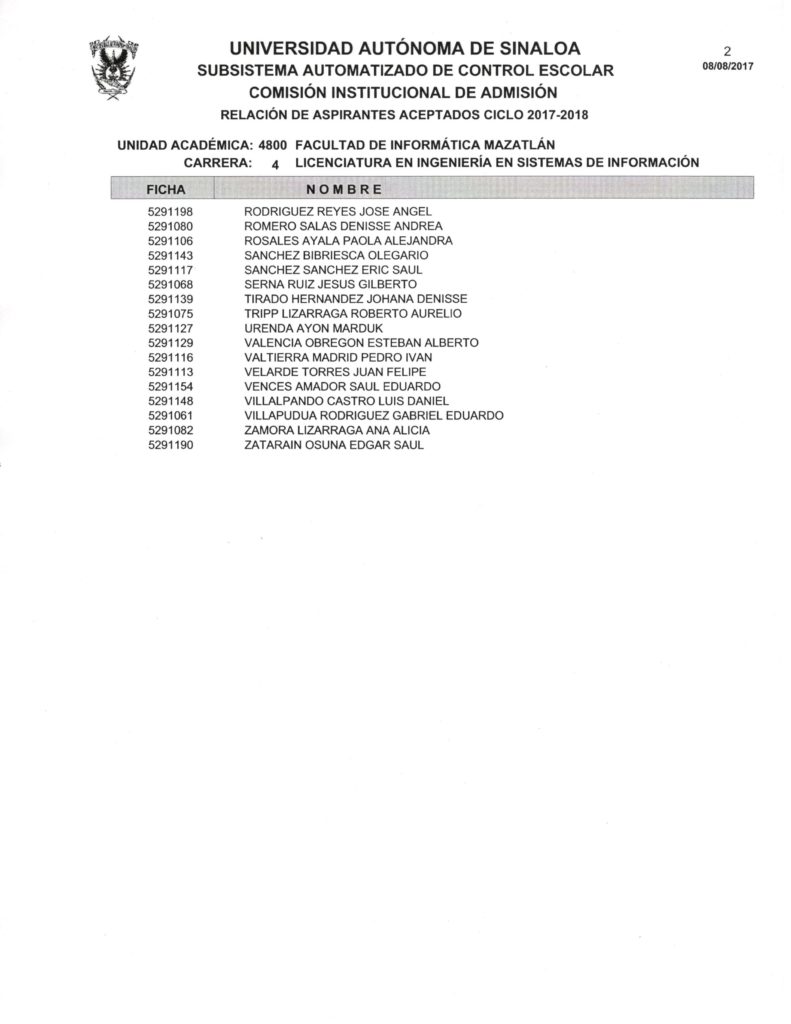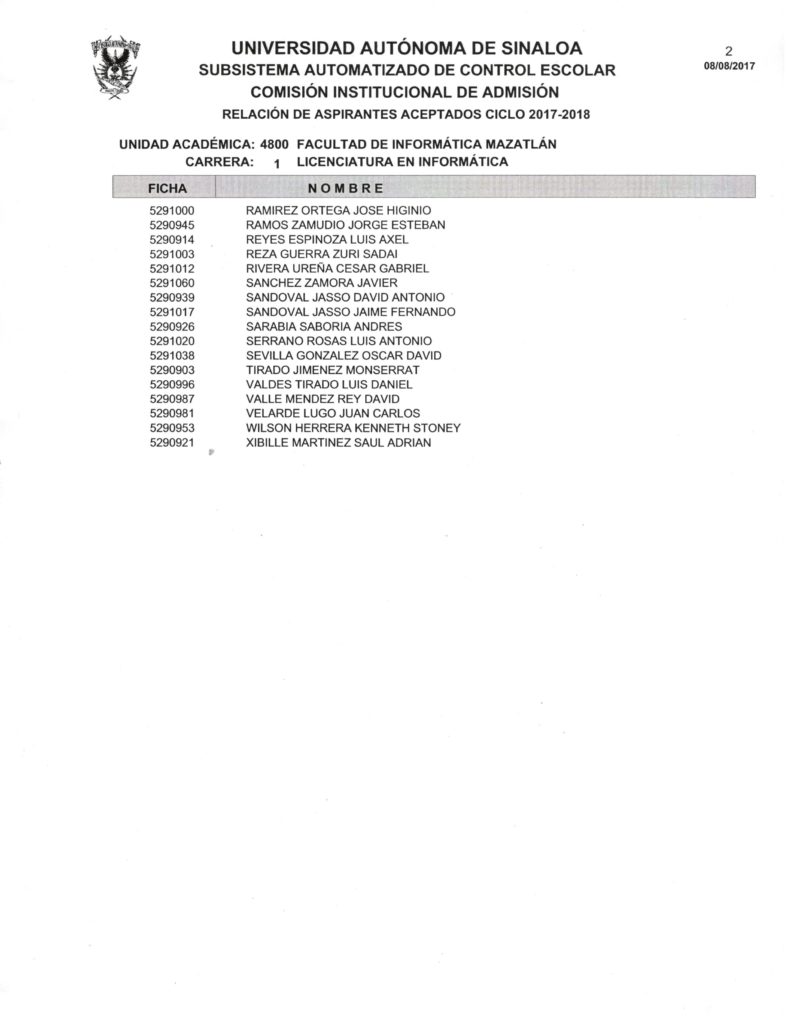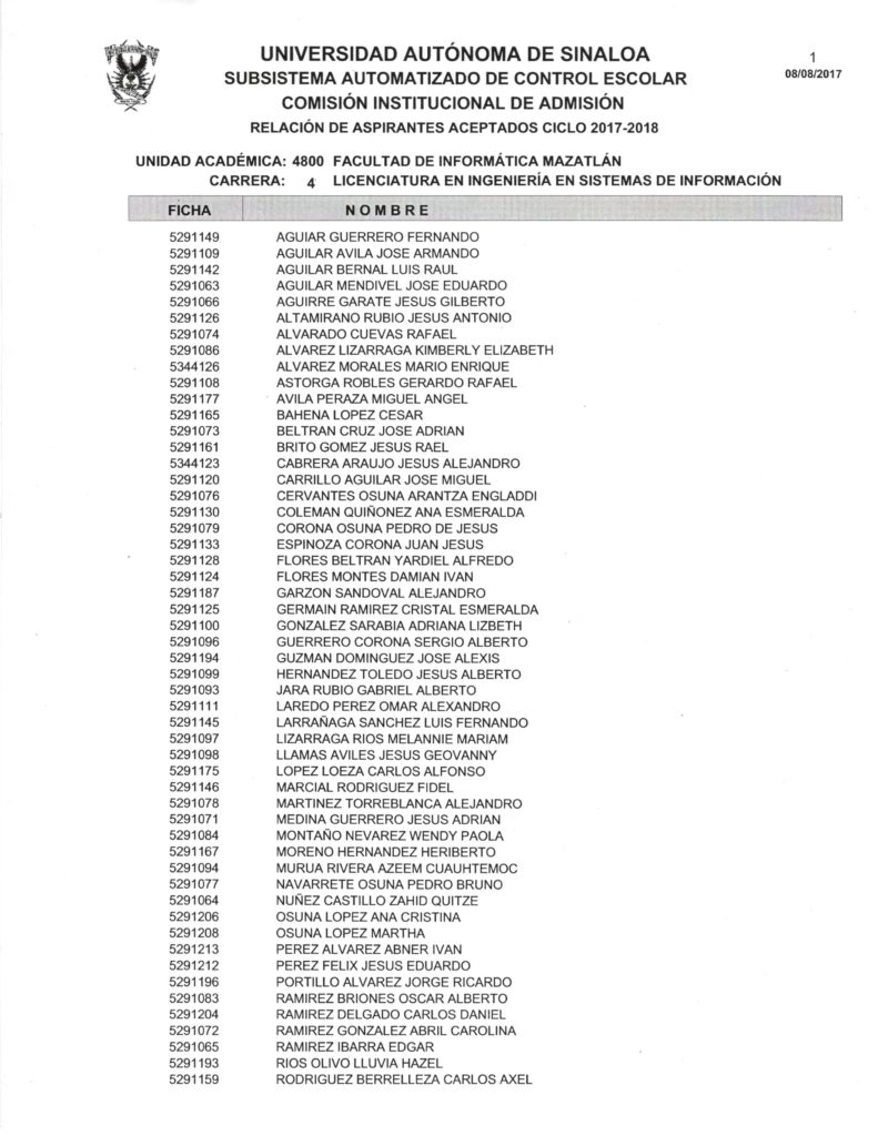 La Facultad de Informática Mazatlán, da a conocer las listas de los aspirantes aceptados al nuevo Ciclo Escolar 2017-2018; de la misma manera se les informa a los aspirantes, que a partir del día lunes 14 de agosto, podrán pasar al Departamento de Control Escolar de la Facultad, para hacerles entrega de los requisitos de inscripción y su recibo de pago.