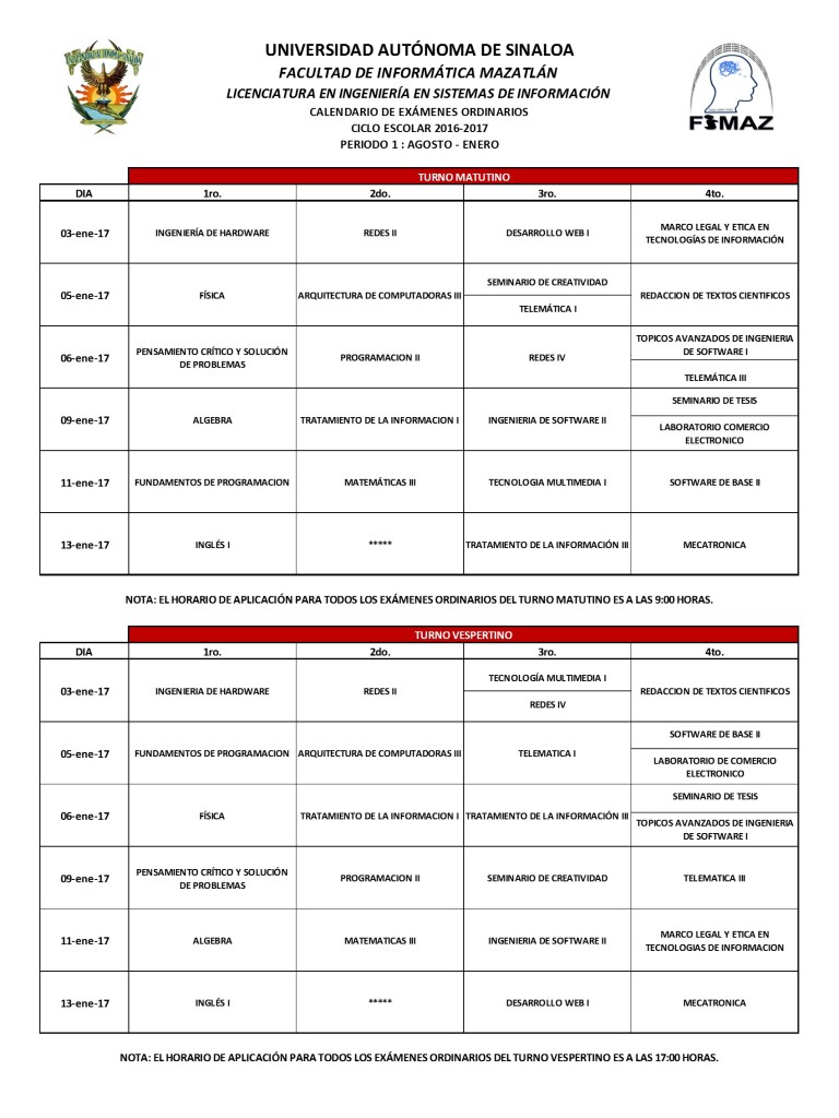 La Facultad de Informática Mazatlán, a través del departamento de Control Escolar, les informa a todos sus alumnos inscritos al nuevo Ciclo Escolar, que los exámenes ordinarios inician a partir del martes 03 de enero al viernes 13 de enero de 2017.