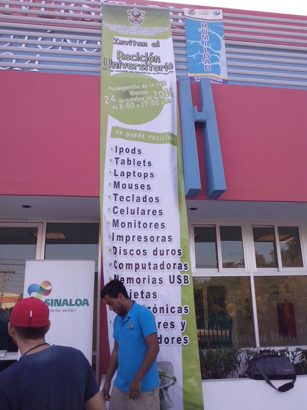 Hoy 24 de octubre se está llevando a cabo en el Polideportivo de la Universidad el “Reciclón Universitario 2014 de Electrónicos Informáticos. Por una sociedad de aprendizaje medioambiental”, con la finalidad de reciclar electrónicos como ipods, tablets, laptops, teclados, celulares, monitores, impresoras, discos duros, computadoras, memorias usb, cargadores, entre otros. De esta forma, todos colaboramos en el cuidado del medio ambiente. La colecta se llevará a cabo este día en horario de 9:00 a 17:00 horas. Se invita a todas las personas a participar!!!