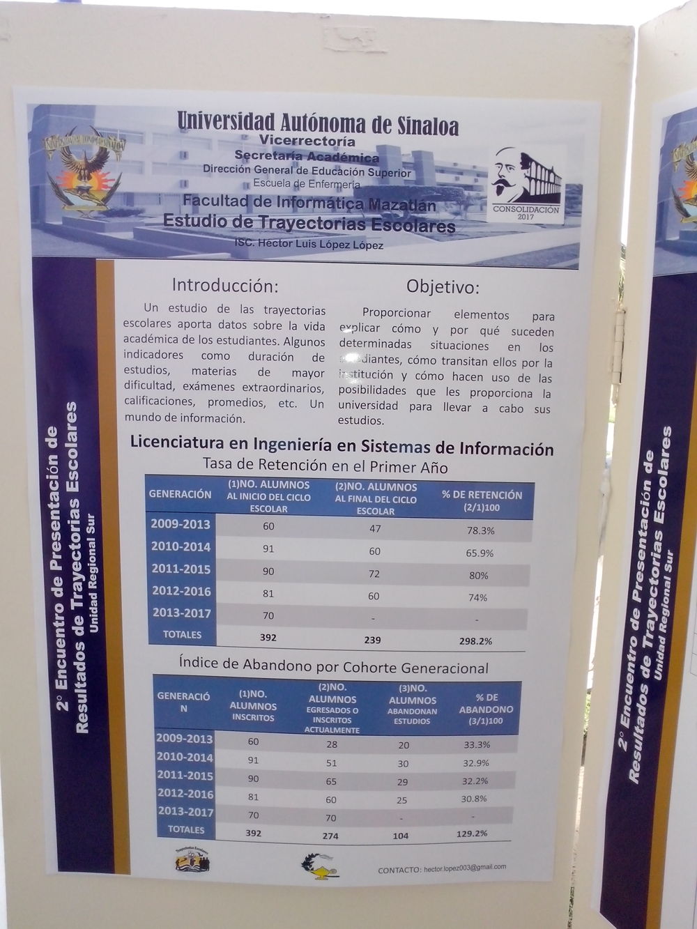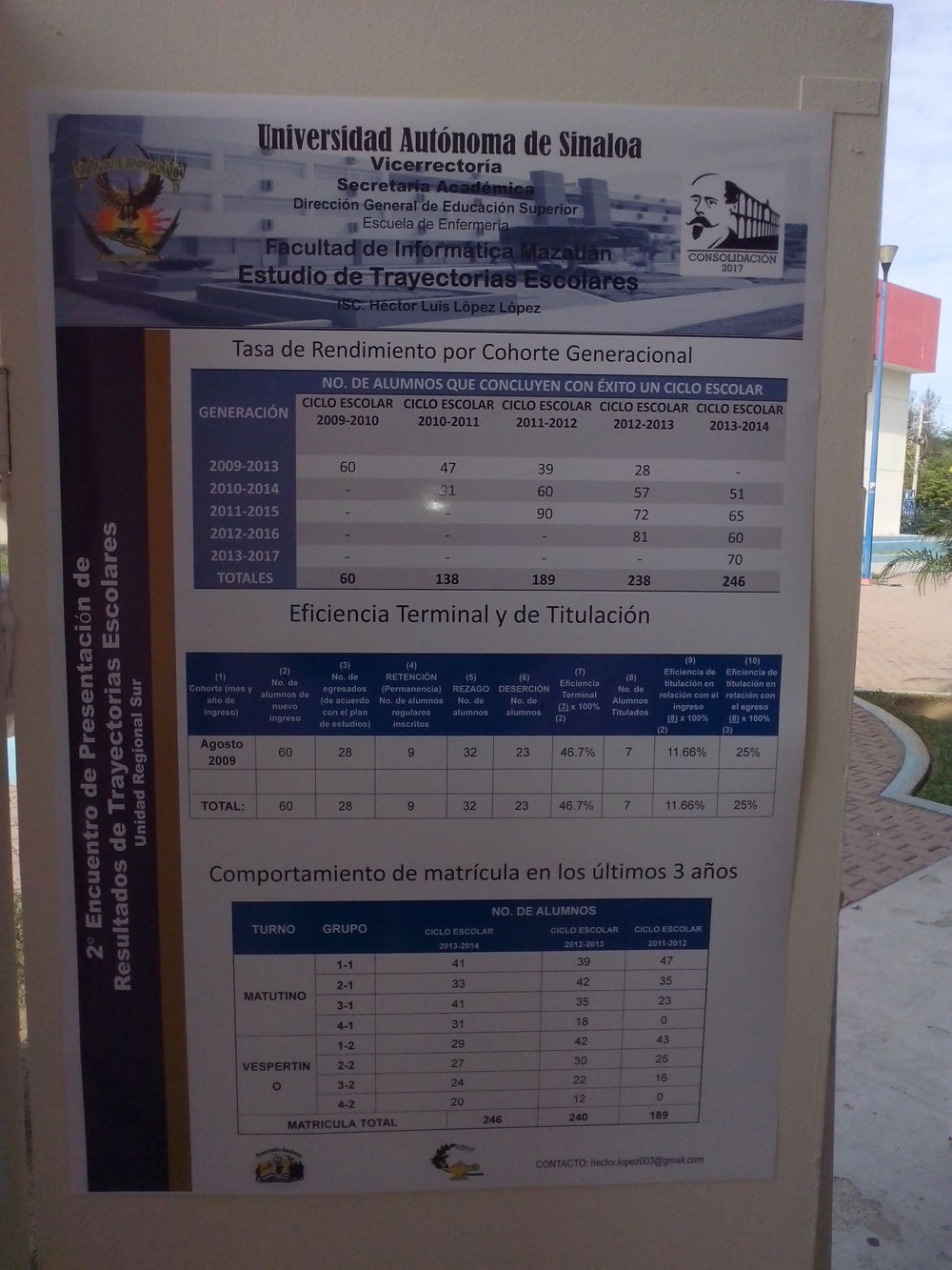 El pasado miércoles 28 de Mayo se ha realizado el 2° Encuentro Institucional de Estudios de Trayectorias Escolares de Nivel Superior en la Unidad Regional Sur, en la Torre Académica de la UAS a partir de las 9:30 horas. En el evento, se han presentado los resultados obtenidos en escuelas y facultades de la Unidad Regional Sur, participando activamente en el mismo la Facultad de Informática Mazatlán.